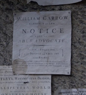 All lawyers aren’t bad- LOL! William Garrow, the son of a humble headmaster (principal), didn’t go to Oxford. He learned at his father’s school, then studied with a mentor (a solicitor) in Billingsgate. Being ambitious and energetic, he eventually pushed aside paperwork (writing briefs) and became a barrister. He tried his first case at age 23- unthinkable in our time! Garrow is the one credited w/ the the phrase “innocent until proven guilty.” He didn’t play it safe, even in his personal life.