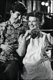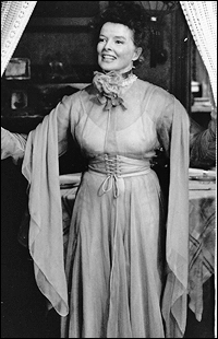 Katherine Hepburn stars as Amanda Wingfield, vivacious Southern belle turned struggling single mom and shop assistant in Tennessee Williams’ autobiographical memory play. The narrator, Tom, is recounting the story from the distance of some years. Amanda, who’s hubby ran off years ago, has two grown children (somewhere in their 20s) who live w/ her in a humble St. Louis rowhouse. Tom (Sam Waterston- best known for Law & Order) grudgingly works at a shoe factory, but desperately longs for adventure and time to concentrate on his writing. Laura (Joanna Miles), his older sister, lives in the world of her own mind- playing w/ little glass animal figures and listening to old records.