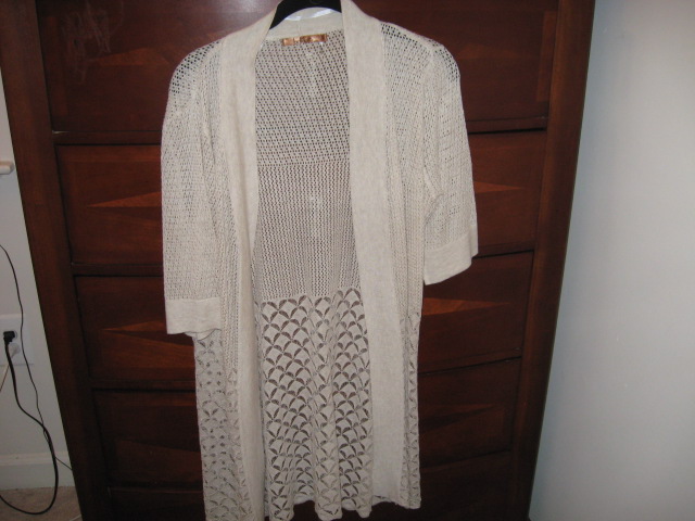 This is an unusually cute shrug/sweater from Marshalls. I love the designs! I think this will look good over a tank (beige, white, etc.), skinny jeans, and sandals.