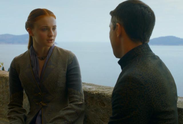 I just LOVED the costumes worn by Queen Cersei Lannister (Lena Headey) and Lord Petyr “Littlefinger” Baelish (Aiden Gillen) in their plotting scene! They talk about what to do about Sansa and the Tyrells. Lannisters lead primarily with force, but the Tyrells know how to play politics better (as some reviewers noted).