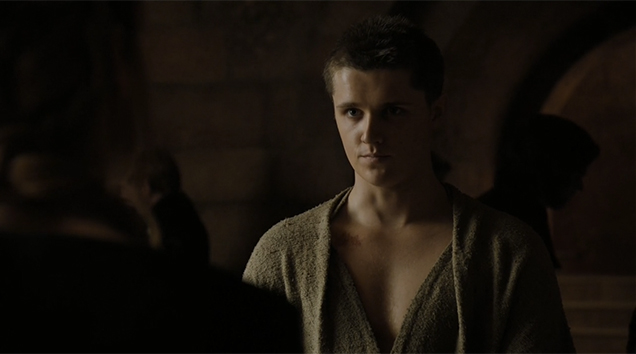 That young orphaned boy (from S4) is training with Jon. Gilly (Hanah Murray) asks Sam (John Bradley) why he’s not fighting (oh, please). He reminds her that he’s killed a Whitewalker and a Thenn- a rare feat for any man. (It’s cool to see Sam w/ some confidence!) Gilly worries that she and baby Sam will be sent away if Ser Alistair (Owen Teale) is chosen as the next Lord Commander.