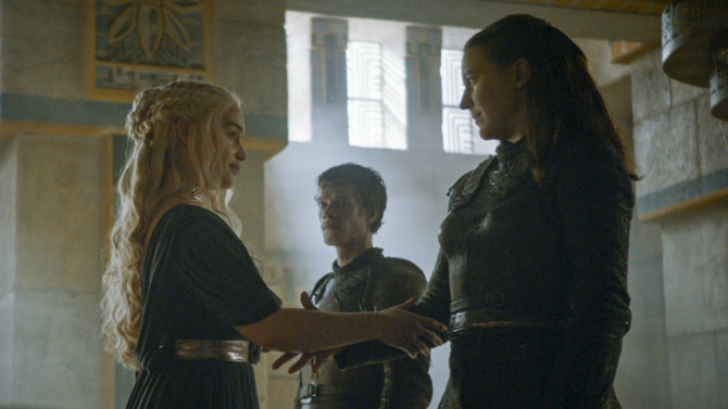 Tyrion seems to be (unofficially) the Hand of the Queen now. Also, wasn’t it cool when gracefully/quickly Grey Worm sliced the necks of the two slavers!