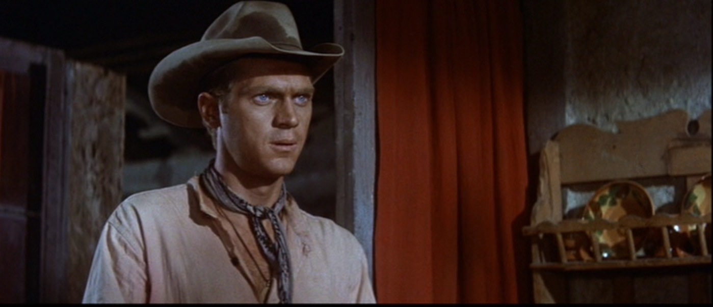 Hmmm… what to say re: Vin (Steve McQueen)? He’s got that trademark tan, gorgeous blue-gray eyes, and GREAT skills on a horse. The way he gets on and off his horse is even cool! I liked this role for him, as it has hints of humor. However, I think he shines even more in The Great Escape (which I saw a few weeks ago for the first time). You can’t deny that this actor has screen presence!