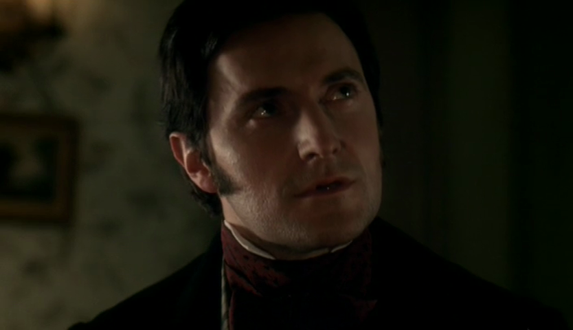 Fanny is riding high now that she’s engaged to Watson, another of the Milton mill owners. She cut down Margaret again, calling her “so severe.” When she mentions speculation, John tells her angrily that “there is nothing certain about speculation!” (The emotion in Armitage’s voice is so strong and powerful!) The little joke (about Fanny’s spending) and smile at the end of the scene is just wonderful, too.